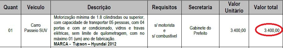 O veículo Tucson – Hyundai, ano 2012, foi alugado por R$ 3.500,00/mês. De acordo com dados da Fipe, o veículo custa em média R$ 54.639,00. Em 16 meses, o valor pago pela prefeitura seria suficiente para comprar o veículo.
