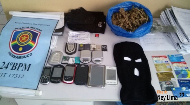 maconha, duas toucas ninjas, oito cartões de banco provenientes de